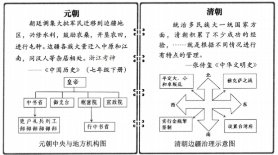 A、①②③ B、①②④ C、①③④ D、②③④28. 顾炎武认为:“八股之害等于焚书,而败坏人材有甚于咸阳之郊。”因为八股取士( )A、导致贫富分化严重 B、阻碍了思想的进步 C、造成官僚机构臃肿 D、动摇了统治的根基29. 朱绍侯在《中国古代史》中写道:“北方地区的民族交融既有各族人民在友好交往中的相互影响,又有统治者的主动政策,还有在血与火的民族斗争中的附带同化。”这表明( )A、民族交融方式多种多样 B、民族交融消除了民族隔阂 C、民族交融只发生于北方C.民族交融促进经济的发展30. 西夏统治者一度模仿孝文帝“改姓元氏”,认为辽宋夏当共奉“中国”之号。清顺治时期,“中国”一词在朝廷文书中已指清朝的全部统治区域。这些现象从根本上反映出( )A、少数民族政权制度全面汉化 B、历代疆域持续扩大 C、中华民族的认同感不断加深 D、中央集权逐步加强三、综合题(本大题共3小题,共40分。)