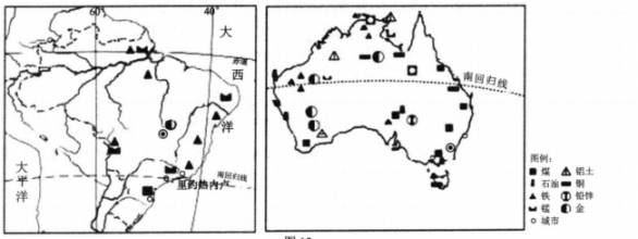 材料三:图左为“巴西矿产资源分布图”、图右为“澳大利亚矿产资源分布图”。