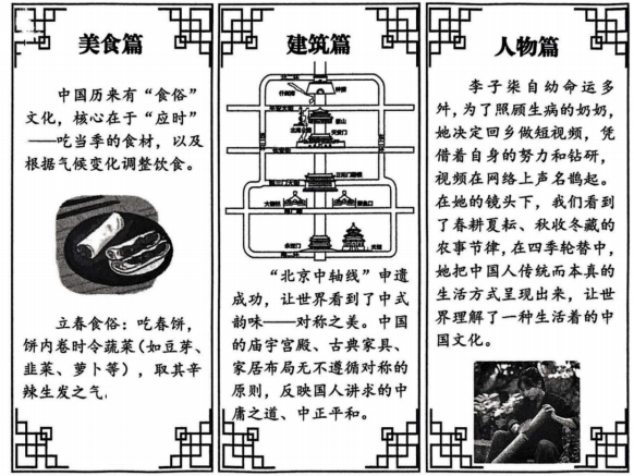 63. 不绽放,不青春。阅读材料,回答问题。(1)、说说你从小明身上品出的“自尊”内涵。(2)、根据材料二并结合所学知识,揭示“迎难破浪”的精神力量。(3)、综合上述材料,谈谈对“不绽放,不青春”的理解。64. 下面是某班制作的“寻找生活里的中式美学”系列展板,阅读展板内容,回答问题。