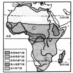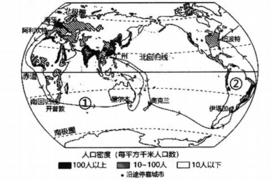 (3)、从图中可以看出,人口分布最稠密的地区是、及北美东部;②处人口稀疏的自然原因A. 炎热湿润