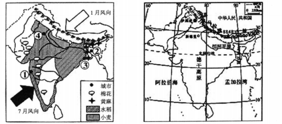 A、①②③ B、①②④ C、①③④ D、②③④(3)、该地区的油气资源多通过萨别塔港外运,很少通过河流运输,主要原因是( )A、距离河流太远 B、河流流量太大 C、河流结冰期短 D、河流沿岸需求少85. 印度是世界水稻、小麦、棉花和黄麻等农作物的主要生产国和消费国。读图8印度农作物及城市分布图和印度的地形图,完成问题。(1)、关于印度农作物分布的叙述正确的是( )A、黄麻主要分布在恒河三角洲 B、小麦主要分布在德干高原东南部 C、水稻主要分布在西部和南部沿海 D、棉花主要分布在德干高原东北部地区(2)、给印度带来充沛雨水的季风是( )A、东北季风 B、西南季风 C、西北季风 D、东南季风(3)、受新冠疫情影响,多个国家和国际组织提倡远程办公。该国下列产业中,最可能借此契机发展的是( )A、农业 B、旅游业 C、软件外包产业 D、运输业86. 非洲这片神秘大陆,自然和人文景观交相辉映,每年都吸引着大批游客前来探索。暑假,小明和父母踏上了前往非洲的旅行。结合图文资料,完成问题。(1)、非洲拥有世界著名的天然野生动物园,这里是众多野生动物的家园。在这里看不到的动物是( )A、猎豹 B、斑马 C、长颈鹿 D、牦牛(2)、.关于四个地点的描述,正确的是( )A、①地很热,满眼是一望无际的沙漠 B、②地阳光明媚,栽种着大量的苹果树 C、③地潮湿闷热,森林茂密,浓荫蔽天 D、④地正值冬季,冰天雪地,银装素裹87. 东南亚地区有丰富的旅游资源,成为中国人出境旅游的热点地区之一。据此完成问小题。(1)、近些年,许多中国人出境旅游选择了东南亚。对其理由的叙述完全正确的一组是( )①热带海岛风光旖旎
