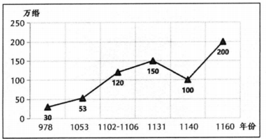 A、①②③ B、①②④ C、①③④ D、②③④17. “澶渊之盟后,宋朝北方州县得以安定,生产有所恢复和发展,出现了‘生育蕃息,牛羊被野(遍地),戴白之人,不识于戈(战争)’局面。”这则材料概述了澶渊之盟的( )A、背景 B、过程 C、内容 D、影响18. “靖康耻,犹未雪。臣子恨,何时灭。驾长车,踏破贺兰山缺。壮志饥餐胡虏肉,笑谈渴饮匈奴血。待从头、收拾旧山河,朝天阙。”这些摘自岳飞《满江红》中的诗句( )A、诉说了南宋灭亡的哀伤 B、说明了宋辽之间的冲突 C、表达了抗金英雄的壮志 D、坚定了抗击倭寇的决心19. 《元史•地理志》记载元朝“北逾阴山,西极流沙,东尽辽左,南越海表”,这说明元代( )A、疆域辽阔 B、科技发达 C、经济繁荣 D、战争频仍20. 下图为“宋代部分年份海外贸易市舶收入统计图”,之所以出现图中现象,是因为宋朝( )①十分重视海外贸易