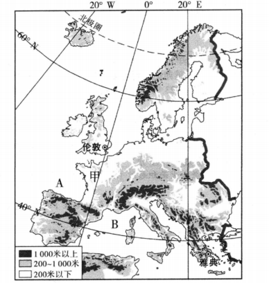 (1)、两国均被同一条重要的纬线(填纬线名称)穿过,两国领土大部分位于(南/北)半球。读图可以发现,两国城市都集中分布在 , 在澳大利亚大火中,丧生的野生动物可能有、(写出二种即可)(2)、巴西的亚马孙平原分布着世界上面积最大的热带雨林,不仅具有的广泛的经济效益还具有更重要的环境(生态)效益。经济效益有:(写出一条即可);环境效益有、等。(写出二条即可)(3)、据图分析,两国发展工业共同的优势条件是。其中,乙国据此优势而被称为“的国家”。里约热内卢是巴西重要的钢铁工业基地,简析其发展钢铁工业的优势。91. 区域学习重在方法,用学习地区的方法来认识欧洲西部。图为欧洲西部的地形图。读图文材料完成下列问题。