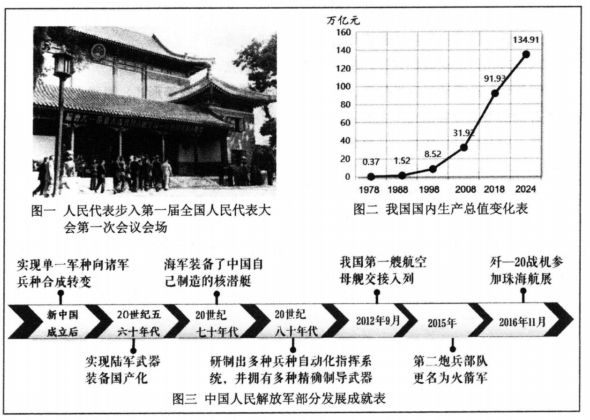 (1)、上述三幅图片分别反映了哪些历史事件?简要概括这些事件的共同作用。(2)、共和国在艰辛探索中逐渐成长。从“成长历程”的梳理中,选择两项史实加以阐释。(要求:紧扣主题,史论结合,条理清晰,概括总结)(3)、综上所述,谈谈你从共和国成长的历史中获取哪些认识。29. 实现中国梦,我们在接续奋斗。阅读材料,回答问题。材料一:实现中国梦必须走中国道路……这条道路来之不易,它是在改革开放30多年的伟大实践中走出来的,是在中华人民共和国成立60多年的持续探索中走出来的,是在对近代以来170多年中华民族发展历程的深刻总结中走出来的。