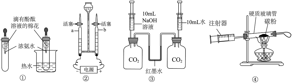 A、A B、B C、C D、D10. 化学学科核心素养展现了化学课程对学生发展的重要价值,下列说法错误的是A、化学观念:H2O和H2O2化学性质不同,因为它们的分子构成不同 B、科学态度与责任:使用无磷洗衣粉,可以减少水体污染 C、科学探究与实践:通过电解水和氢气的燃烧,证明水由氢元素和氧元素组成 D、科学思维:二氧化碳能使燃着木条熄灭,能使燃着木条熄灭的气体一定是二氧化碳11. 化学是一门以实验为基础的科学。关于下列实验的说法中,不合理的是A、实验①:探究温度对分子运动的影响 B、实验②:探究水的元素组成 C、实验③:验证NaOH能否和CO2反应 D、实验④:测定空气中氧气的含量12. 下列对实验现象的描述正确的是A、二氧化碳通入紫色石蕊溶液中,溶液变蓝 B、铁丝在氧气中燃烧:剧烈燃烧,火星四射,放出大量的热,生成黑色固体 C、电解水实验:两个电极附近产生气泡,一段时间后,正、负极产生的气体体积比约为2:1 D、甲烷在空气中燃烧:产生蓝色火焰,生成水和二氧化碳13. 下列实验设计、现象均正确,且能达到实验目的的是选项