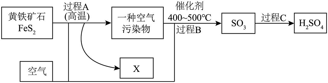 18. 硫酸是一种重要的化工原料,下图展示了工业上用黄铁矿石(主要成分是FeS2)炼铁过程中将间接得到的一种空气污染物“变废为宝”转化为硫酸产品消除污染,增加效益的工艺流程。请回答下列问题:(1)、过程A中发生的化学反应方程式是4FeS2+11O22X+8SO2 , 则X的化学式是。(2)、请写出过程A反应结束时得到的空气污染物中硫元素的化合价。(3)、过程C是属于化合反应的基本类型,其中有一种液态反应物被隐藏了,请根据所学知识猜测过程C所发生的化学反应方程式:。19. 请沿用科学家认识事物的方式认识“空气”,并完成下列问题(1)、分类角度,下列关于空气的说法正确的是 。A、空气是由空气分子构成 B、N2、O2等均匀地混合 C、N2、O2不再保持各自的化学性质(2)、微观角度,用“”表示氮原子,“