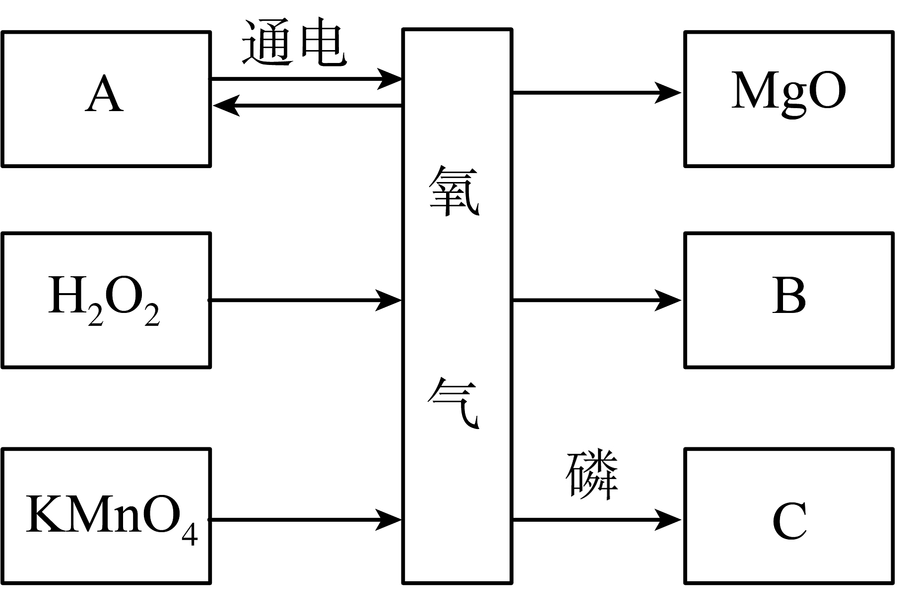 16. 建知识网络是学习化学的重要方法。如图是小明同学绘制的表示氧气制取和化学性质的部分网络图,A、B、C分别表示初中化学常见的物质,B由铁丝在氧气中燃烧生成。