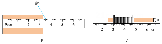 请你指出图中两点不足之处:①;②。(2)、图乙是小科测量细铜丝直径,请你帮助小科同学计算铜丝的直径为cm。23. 填写合适单位或者数据:(1)、珠穆朗玛峰海拔8.84443 ;(2)、一瓶大雪碧体积为2.5(3)、50=L(4)、一枚硬币的厚度约为2.1。24. 小科想准确测量小石块的体积,先在量筒中倒入适量的水,在读数时视线应与相平,放入石块后再此读数,根据图中示录小石块的体积为cm3。旁边的小王发现放入石块后小科是俯视读数的,那么他测量的石块体积(填“≥”“=”或“<”)石块实际的体积.25. 小科尝试自制一支温度计(如图甲所示)。烧瓶中装有空气,玻璃管中间封有一段红色液柱。他把烧瓶先后放入50℃热水、25℃室温环境和0℃的冰水中,并标出红色液柱右侧所在的位置(放大后效果如图乙所示)。(1)、此温度计是根据原理制成的。(2)、红色液柱右侧所在的位置A、B和C,其中表示0℃水温对应的点是(填“A”“B”或“C”)。(3)、其他小组同学利用上述器材自制相同的温度计,测不同水温时,发现红色液柱始终没有移动,试分析其中的原因(写出一点即可)。26. 常用的液体温度计是根据原理制成的,如图所示的温度计中,甲温度计的示数为℃,乙温度计的示数为℃。27. 如图,仔细观察图中两条横线,你觉得它们是直线吗?用直尺来判断一下,它们 直线。这说明单凭我们的感官,常常不能对事物做出准确的判断,所以进行实验时,需要借助 。28. 以下为某校学生进行“温度计发展史”的项目化学习的部分片段,通过查阅资料整理了温度计发展史。请完成下列问题:(1)、上述三种温度计都是利用了物质的制成的。如上图的气体温度计,当环境温度降低时,管中水柱液面将(选填“上升”、“下降”或“不变”)。(2)、在相同的受热条件下,将两个形状、厚度相同的铜片和铁片焊在一起就可制成上图中的固体温度计。已知铜的膨胀程度比铁大,当温度升高时,指针会偏向侧(选填“A”或“B”)。(3)、如图甲是小黄制作的一个简易液体温度计。使用时发现该温度计管中液柱移动不明显,导致示数不够精确,对此请你提出一条改进建议。三、实验与探究题(本大题共4小题,每空2分, 共28分)
