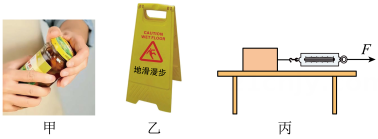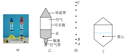 (1)、分析表格中的数据,可得出的结论是。(请完整表述)(2)、实验中,有同学将用一张白纸挡在玻璃板和像之间,你认为该同学还能否透过玻璃板观察到蜡烛的像吗?并说明理由。(3)、像与物体关于平面镜对称,请你根据对称性画出物体AB 在平面镜中成的像A’B’。18. 科学课上,同学们开展“制作照相机模型”的项目化学习活动,活动包括学习原理、制作简易照相机、评价模型作品三个环节。(1)、在该模型中,应选用透镜作为镜头。(选填“凸”/“凹”)(2)、小瑞制作如图1所示的模型,透镜的焦距为f,透镜与半透明膜的距离v满足f<v<2f,胶片上成的像的特点是。(3)、小瑞同学进行测试时,发现拍摄不同距离的景物时,有时清晰,有时会模糊,请你指出该模型可能存在的缺陷是。19. 某项目化学习小组利用可乐瓶等材料制作水火箭(如图甲),并进行飞行高度测试笑验。水火箭的结构如图乙所示。将水火箭竖立于地面,用打气筒通过打气管向瓶内打气,当瓶内气压足够大时,瓶塞脱落,瓶内的水向下喷出,水火箭就接近竖直地向上飞。(1)、请在丁图中画出水火箭在上升过程中受到的重力的图示(水火箭受到的重力为10牛)。(2)、如图丙所示,小组同学用频闪照相机拍下了水火箭从A 处起飞,到C 处达到最高点的运动情况,请描述从发射到达最高点时,水火箭运动速度的变化过程:。(3)、水火箭到达最高点C时,若此时撤去一切外力,水火箭将保持状态。20. 家里的罐头瓶盖得太紧(如图甲所示),拧不开了。小嘉就在瓶盖外包上毛巾,再用力拧,毛巾在打滑,瓶盖还是没动。爸爸让他换一条湿毛巾试试,果然,湿毛巾不再打滑,瓶盖打开了。由此,他觉得水有助于增大摩擦力。但为什么许多公共场合的地面在用水打扫过后会摆放“地滑慢步”的牌子(如图乙所示),水量到底能增大摩擦还是减小摩擦?为了解决困惑,他设计了如图丙所示的实验:在水平玻璃桌面上滴不同滴数的水并涂匀,立即用弹簧测力计拉着一块用油漆漆过的木块在玻璃桌面上做匀速直线运动,测出摩擦力,记录数据如表所示。