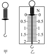 (1)、图一中最下端的小孔水平喷水距离最大,说明同种液体,深度越 , 液体压强越大。(2)、实验中每一组实验的数据都需要多次重复测量,其目的是;(3)、实验中如何保障水流从小孔水平射出的速度相同?。(4)、根据小瑞的实验,解释图二中最下端的小孔喷水最远距离不是最大的原因。22. 某兴趣小组成员各自用一根弹簧、一块纸板、指针和挂钩等制作了一个弹簧测力计。他们打算用50g的钩码对弹簧测力计进行刻度值的标定,并用自制的弹簧测力计进行测量。(1)、任务一:计算与标定刻度如图甲,把一根下端带有挂钩的弹簧上端固定在纸板上,让弹簧自由下垂,在指针所指的位置标出ON;在挂钩上悬挂一个50g的钩码,在指针所指位置标出相应的刻度值N。接着,在挂钩上分别悬挂不同个数的50g钩码,在指针所指的位置分别标出相应的刻度值。
