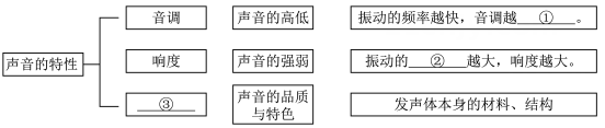 14. 思维导图是一种有效的复习方式,以下是小瑞关于有关“声音的特性”的知识结构图,请你补全该结构图。