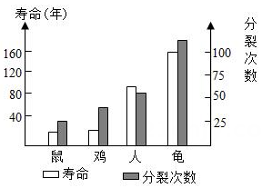 实验二:分别将鼠、鸡、人和龟的体细胞在体外进行培养,结果如右图。