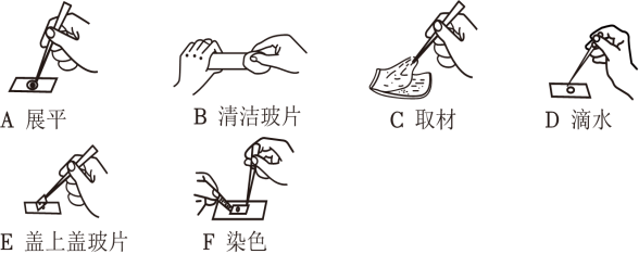 25. 图为洋葱表皮细胞临时装片的制作步骤图(顺序被打乱),请回答下列问题:(1)、请写出洋葱表皮细胞临时装片的制作步骤的正确顺序。A. D→B→C→A→E→G→F B. B→D→C→A→E→G→F