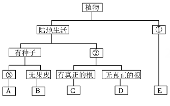 A、A B、B C、C D、D10. 小金在学习了“常见的植物”后,将校园内的桂树、银杏、苏铁归为一类;将团藻、肾蕨、葫芦藓归为一类。他分类的依据是( )A、有无种子 B、有无果实 C、有无叶绿体 D、有无根11. 在两栖类展馆中,小嵊发现有一种水草长势旺盛,经查阅资料后发现这种水草叫做金鱼藻。金鱼藻的茎细柔、叶轮生、花小、种子有坚硬的外壳。金鱼藻属于( )A、藻类植物 B、苔藓植物 C、裸子植物 D、被子植物12. 某同学对如图所示的生物进行了观察和记录,其中错误的是( )。A、图甲为苔藓植物,植株矮小,有根、茎、叶的分化 B、图乙为蕨类植物,叶片的下表面有孢子囊 C、图丙为被子植物,种子外面有果皮包被,用种子繁殖后代 D、图丁为裸子植物,种子外面无果皮包被13. 下列植物依次按藻类植物、苔藓植物、蕨类植物、裸子植物、被子植物排列的是( )A、海带、葫芦藓、蕨、苏铁、柑橘 B、水藻、胎生狗脊、地钱、红松、银杏 C、紫菜、葫芦藓、蕨、苹果、葡萄 D、水绵、地钱、胎生狗脊、玉兰、红松14. 小德建立了如图所示的植物检索表,将植物分为藻类植物、苔藓植物、蕨类植物、裸子植物、种子植物。下列说法错误的是( )A、②为无种子 B、肾蕨对应表中C C、植物D无茎叶的分化 D、植物E属于藻类植物15. 对下列诗句中植物的特征描述错误的是 ( )A、亭亭山上松——种子裸露 B、无竹令人俗——能产生孢子 C、苔痕上阶绿——没有根 D、采菊东篱下——能开花结果二、填空题