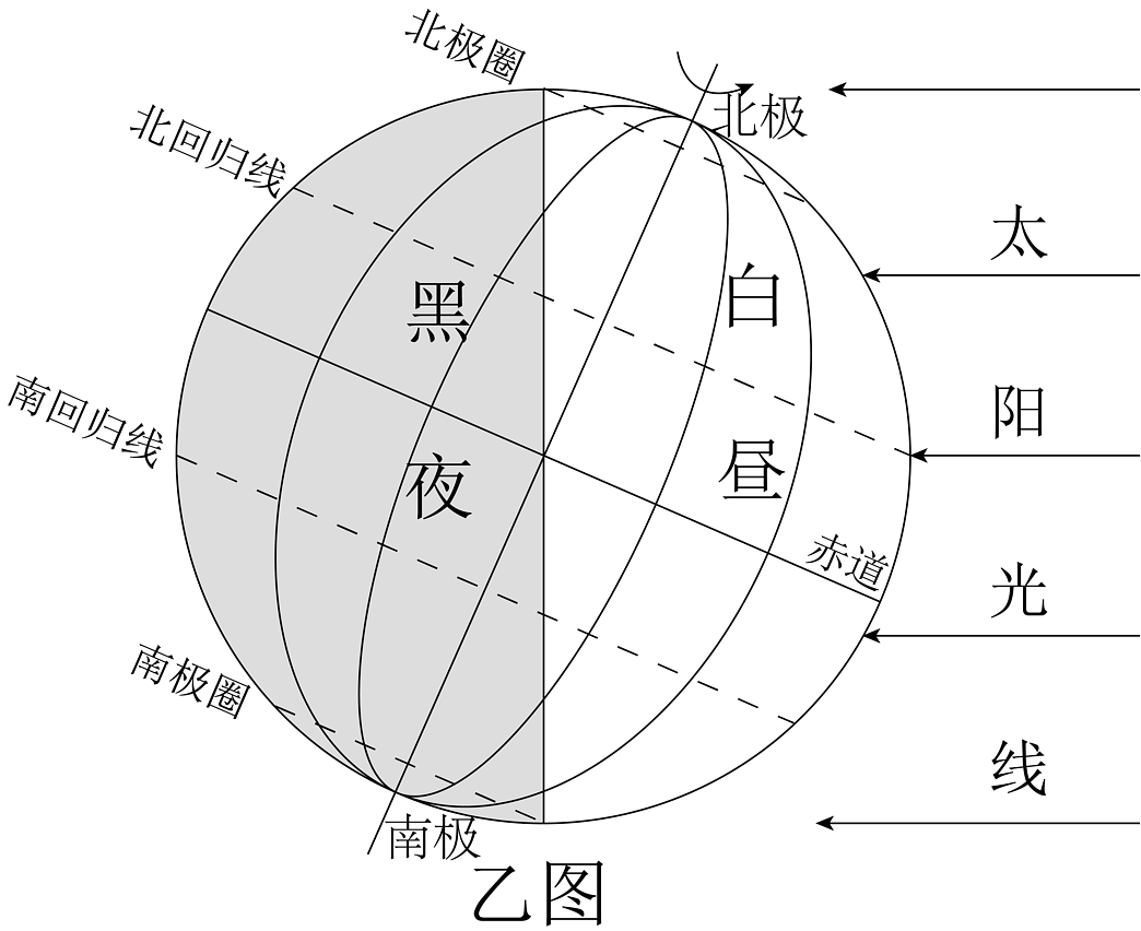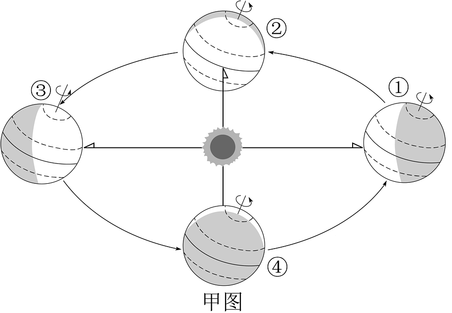 材料三:下面为地球公转示意图(甲图)和太阳光照图(乙图)。