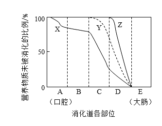 10、如图曲线为淀粉、脂肪和蛋白质在消化道中被消化的示意图。下列叙述正确的是( )A、曲线Y表示淀粉的消化过程 B、纵坐标100表示营养物质完全被消化 C、在C处,蛋白质被初步分解 D、B和D既有消化功能又有吸收功能