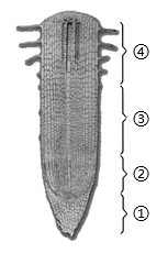 11、小明参与“种一棵梭梭树”志愿活动时,发现之前栽的梭梭树幼苗根部深深扎人沙层。如图是根尖结构图,根能不断向下生长主要依靠( )A、①② B、②③ C、③④ D、②④