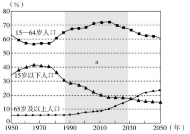 1、读“我国不同年龄段人口比例变化(含预测)示意图”。完成下题。(1)、在a时期,我国的人口特点是( )