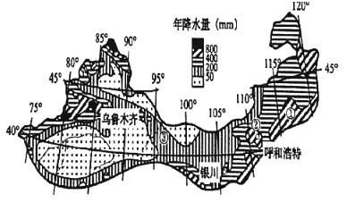 16、读我国局部地区年降水量分布示意图,完成小题。(1)、图中①②③三地降水分布的特点是( )A、自①地向③地降水递增 B、自①地向③地降水递减 C、①③两地降水多于②地 D、①③两地降水少于②地(2)、该地区突出的自然特征是干旱。产生这一特征的原因,按因果逻辑关系排列正确的是( )