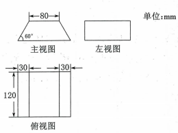 10、如图所示为某个几何体的三视图.(1)、请描述这个几何体的形状.(2)、按三视图的实际尺寸,画出它的表面展开图(按10:1的比缩小).(3)、求这个几何体的侧面积和表面积.