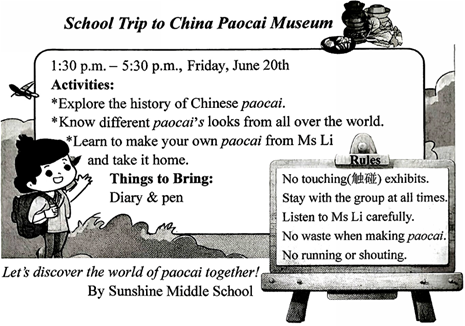 A、ab B、cd C、ad(3)、What does Ms Li do ?A、She's a museum guide (讲解员). B、She's a teacher at Bishan Middle School . C、She teaches children to make paocai in the museum .(4)、Which rule should students follow according to the poster ?A、B、