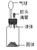 19、如图装置中,将胶头滴管中的液体滴在固体上,能使小气球鼓起来,则使用的固体和液体不能是( ).