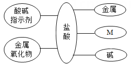 10、构建知识网络,可以帮助我们理解知识间的内在联系。如图是盐酸与不同类别物质之间反应的知识网络。(1)、图中M应为类物质 (填物质类别)(2)、写出一种能与盐酸反应的金属氧化物