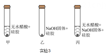 (3)、利用酸碱反应有水生成进行验证。实验3是醋酸与氢氧化钠固体进行的三个实验,其中硅胶具有吸水性,吸水后由蓝色变红色。若醋酸与氢氧化钠固体能反应,你能预测的实验现象是:。