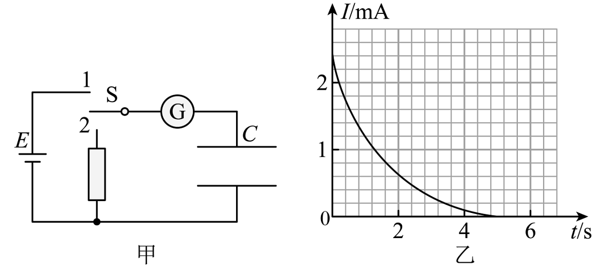 11. 如甲图所示是观察电容器的充、放电现象的实验装置.电源输出电压恒为 , S是单刀双掷开关,G为灵敏电流计,C为平行板电容器.