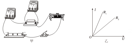 14. 在如图所示的电路中,三个电表A、B、C均连接正确,闭合开关后,两个小灯泡L1、L2均正常发光,A、B、C的读数分别为1.5、4.8和1.2(单位均为V或A)。(1)、图中的三个电表中,属于电压表的是(填字母)。(2)、电路中L1 的电阻为Ω。15. 如图为甲、乙两电器元件的电流与电压关系图。(1)、随着电流增大,甲元件的电阻(选填“增大”、“不变”或“减小”)。(2)、当将甲、乙两元件并联在6V电源电压下,则电路中总电流为A。16. 电阻R1与R2的I﹣U图象如图所示。当R2上的电压为1.5V时, R2的阻值是Ω;若将它们并联连接到电压为2.5V的电源上,则干路的电流是A。17. 小嘉同学利用如图甲所示的电路研究电流、电压、电阻之间的关系,电源电压恒为3V,实验中小嘉更换了5Ω、10Ω、15Ω、20Ω、25Ω共5个定值电阻Rₓ, 得到如图乙所示的图像。请回答:(1)、本次实验小嘉研究的是的关系。(2)、通过本实验,可以初步得出的实验结论是。18. 如图所示为小灯泡L和定值电阻R的电流与其两端电压的关系。完成下列问题:(1)、 则图中表示灯泡的是(填“a”或“b”) ;(2)、当把它们串联在0.8安电路中时,L的电阻为欧;(3)、当把它们并联在2伏电路中时, 电路的总电阻为欧。19. 如图a所示的电路,电源电压保持不变。闭合开关S,调节滑动变阻器,两电压表的示数随电路中电流变化的关系图像如图b所示,根据图像的信息可知:(填“甲”或“乙”)是电压表 示数变化的关系图像,电源电压为伏,电阻 的阻值为欧。