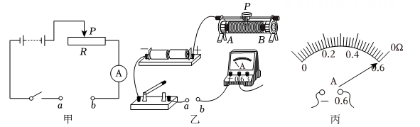 (3)、同桌的小滨分别用两个阻值未知的电阻R1和R2进行实验,得到两个电阻的I-U图象,如图乙所示。由图象可判断出R1R2。 (选填“>” “<”或“=”)24. 同学们通常用“伏安法”测量并计算某导体的电阻。科学兴趣小组设计并制作了一个可以直接测量电阻阻值的仪器。他们设计了如图甲所示的电路,a、b为接线柱用于接待测电阻。当a、b接入电阻阻值不同时,电流表示数也随之改变,在电流表相应位置标上对应电阻值。已知电源电压恒为9V,电流表量程为0.6A。(1)、根据电路图甲用笔画线代替导线在图乙中完成实物图的连接,使滑片P向右移时阻值变小。(2)、标零。用导线将a、b直接连起来,移动滑动变阻器R的滑片P,使电流表指针正好偏转到满刻度0.6A处,在此刻度处标为“0Ω”,如图丙所示,此时变阻器接入电路中的阻值R=Ω。(3)、标刻度。调零后保持滑动变阻器阻值不变,将一个阻值为 30Ω的定值电阻接入a、b接线柱后,计算此时电流表示数应为 A,在电流表该刻度处标上“30Ω”。据此原理,可把电流表改为测量电阻的仪器。测量。使用制作的测电阻仪器测未知导体的电阻。