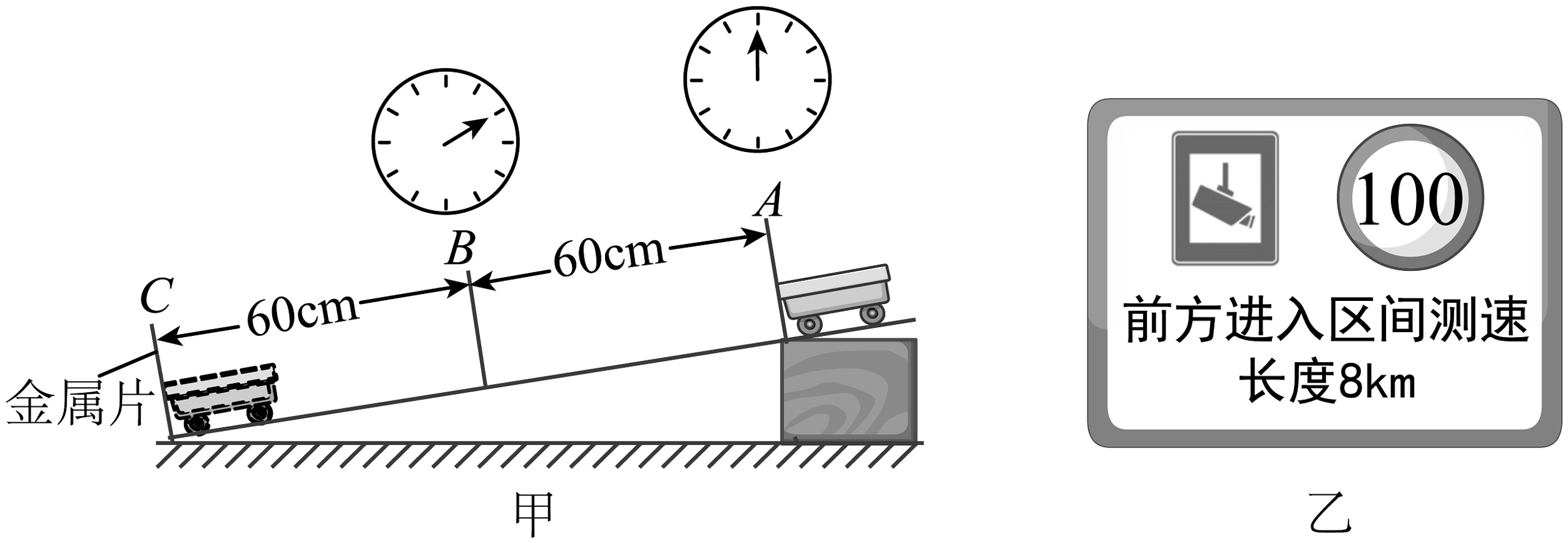 (1)、为了便于测量小车在斜面上的运动时间,应使斜面保持很的坡度。(2)、图甲中秒表每格时长为1s,该次实验中秒表指针旋转不足一圈,小车从A点由静止下滑,到达C点,所用时间为2.8s,则小车通过BC段的平均速度为m/s。(3)、由实验可得:小车在下滑过程中速度越来越(选填“大”或“小”)。【解决生活实际问题】如图乙是高速公路上的区间测速提示牌。