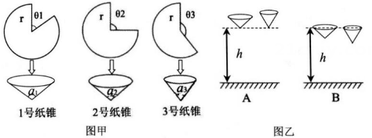 (1)、实验中除了刻度尺外,该实验还需要的测量器材是;(2)、 表格中的“? ”部分应填;(3)、该同学用三个半径均为r的圆纸片,进一步探究锥角大小对纸锥下落速度的影响,他剪出3个不同规格的扇形纸片,制成了如图甲所示的3个纸锥。按上述同样方式测量。①为控制纸锥从同一高度下落,纸锥的下落高度应选择图乙中的;