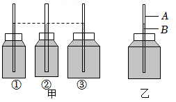 (1)、气体温度计:当玻璃管内水柱下降时,环境温度(填“升高”“降低”或“不变”)。(2)、液体温度计:实验室里常用的水银温度计是利用了水银的性质制作的。(3)、固体温度计:在相同的受热条件下,将两个形状、厚度相同的金属片①和②焊在一起就可制成双金属片温度计。若受热后金属片①更易膨胀,当气温升高时,指针会偏向中央刻度线的(填“A”或“B”)侧。(4)、【产品制作】如图乙是该小组制作的一个简易液体温度计,使用中发现该温度计玻璃管中液柱移动不明显,导致示数不够精确。请你提出一条改进措施:。27. 如图甲所示为小乐用玻璃药瓶、透明吸管、滴有红墨水的水等自制的三支温度计①②③其中③的玻璃药瓶最大,①②的玻璃药瓶相同;②的透明吸管内径最大,①③的透明吸管内径相同。回答问题:(1)、若①②③最初液面高度相同, 则(选填“①”“②”或“③”)的测量精度最高。(2)、为了给③标定温度值,小乐将③分别放入40℃和10℃的水中,待液面静止后,标出红色液柱到达的位置并记作A和B,如图乙所示。若小乐要在透明吸管上标出70℃的刻度,则正确的操作是。28. 小乐设计并制作了一款保温杯垫,实践步骤包括:a.制作保温杯垫,编写使用说明书;