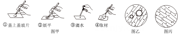 8. 请将图中所示的结果填在相应的空格处。(1)、 图甲中, 液体的体积是mL。(2)、图乙中,每一个圆柱体的直径是cm。(3)、 图丙中, 气温为℃。9. 细胞是生物体结构和功能的基本单位。用显微镜观察细胞的结构,通常需要将观察的标本制成临时装片。图甲是制作洋葱鳞片叶表皮细胞临时装片的部分步骤,图乙、图丙是两位同学在显微镜下观察到的洋葱鳞片叶内表皮细胞的视野图,据图回答。(1)、图甲所示临时装片制作步骤的先后顺序应是(填序号)。(2)、小明同学在用显微镜观察细胞过程中,发现视野中有一个污点,这个污点不可能存在于____。A、物镜 B、目镜 C、反光镜 D、玻片标本(3)、制作临时装片时,对标本进行染色的目的是为了在显微镜下更清晰地观察到细胞内的(填细胞结构名称)。(4)、在图乙、图丙中制作效果欠佳的装片是哪一个,并说明产生原因。(5)、小明将物像调清晰后,让几个同学围过来观察,却看到视野变暗了。他们都没有触碰显微镜,请你帮他分析原因.10. 关于制作和观察人体口腔上皮细胞实验,请根据图回答相关问题。(1)、图1中几个实验步骤,正确的操作顺序是(填标号)。(2)、如果要把位于视野右上方的物像移至视野的中央,应将载玻片向移动。(3)、如图2,假如你所用的显微镜只有甲、乙、丙、丁四个镜头,若想在视野中细胞数目最多,你认为应选用的镜头组合是。(4)、某同学按正确的操作步骤观察到口腔上皮细胞后把显微镜推移到同桌面前看,结果视野变暗,同桌要想看清物像,最先应进行的操作步骤是。11. 为测量小石块的体积,甲同学的做法是先将石块置于量筒中,同时往量筒中注入水,使水全部浸没石块记下水的体积V1 , 取出石块后记下水的体积V2 , 计算石块的体积为 乙同学的做法是先在量筒里注入适量的水,记下水的体积V1 , 然后轻轻放入石块,使量筒里的水完全浸没石块,记下水及石块的体积V2 , 计算石块的体积为 , 比较这两种方法回答下列问题。(1)、为了使实验结果更准确,应选择(选填“甲”或“乙”)同学的做法。(2)、选择正确方法后测量结果如图一所示,则测得这块小石块的体积是 。(3)、实验后两同学对测量结果进行了讨论,以下操作会导致乙同学测量结果偏大的是____。A、捆绑小石块的绳太粗,读数均正确 B、注入一定量水后俯视读数,其余读数正确 C、待小石块浸没后仰视读数,其余读数正确 D、在浸入小石块时不慎有水滴溅出,读数均正确(4)、甲同学提出量筒也可以测量气体的体积,如图二所示。利用等效替代法,通过读取液体的体积来确定气体体积,图二装置中能实现这一目的的是。12. 在标准大气压下,一支没有刻度的温度计,插入30℃的温水中,水银柱长度为10厘米,插入冰水混合物中时,水银柱长度为1厘米。(1)、则测量100℃的沸水时,水银柱长度为厘米;(2)、当插入一定温度的热水中时,水银柱长度为19厘米,则此热水的温度为℃。13. 下面是常见的五种植物(海带、食用苔藓、蕨菜、银杏、番茄)的检索表。(1)、检索表中生物的特征或生活环境还未填完全,其中乙是。(2)、若将上述五种植物填入表中,则A为;E为。(3)、对于植物,有如下说法:①都是多细胞生物;②都不产生种子;③都有根、茎、叶的分化;④都能进行光合作用。其中属于 CDE三种植物所共有的特征是。(填序号)