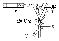 某同学利用橡皮管、漏斗、水、相同的塑料颗粒、注射器等材料制作了如图所示的模型。