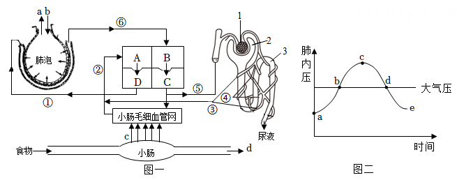 21. 可穿戴式人工肾有望成为一种用于治疗慢性肾功能衰竭患者的便携式设备,如图1为可穿戴式人工肾的工作原理示意图。(注:血液入口为A1 , 血液出口为A2;透析液入口为B1 , 透析液出口为B2)请分析回答问题:(1)、泌尿系统中肾脏的功能是。(2)、研究人员抽取透析器入口和出口的血液,经检测,入口A1处尿素的平均浓度为62mg/d,出口A2处尿素的平均浓度为17mg/dl,说明透析器可以模拟图2肾单位中(填数字)在尿液形成过程中的作用。透析后的血液经静脉输回体内,最先到达心脏中的哪个腔?。(3)、为了提升透析器的功能,研究人员将某种细胞融合到透析器中的半透膜上,然后在入口A1处注入0.3g/L葡萄糖溶液,经检测,出口A2处葡萄糖溶液浓度高于0.3g/L,你认为这种细胞最可能来源于图2中的哪个结构?(填数字)理由是。22. 马拉松是一种高强度、长距离的竞技运动。图一是人体部分生理活动示意图,A—D表示心脏四腔,a-d表示生理过程,①—⑤表示相关血管,1-3表示构成肾单位的相关结构。图二表示某人一次平静呼吸中,肺内气压的变化曲线。请回答:(1)、马拉松运动需要消耗大量能量,食物中为运动员供能的主要物质被消化为才能通过图一中吸收过程进入血液,在其随血液循环运输到下肢骨骼肌细胞的过程中,依次经过心脏四腔的顺序是(填字母)。(2)、运动过程中,运动员呼吸频率加快,呼吸深度加深,以获得更多的氧气。图一中b过程对应图二中曲线的段,此时膈肌处于状态。(3)、过量运动可能会导致蛋白尿等异常症状,原因是图一中(填序号和名称)的通透性增加。