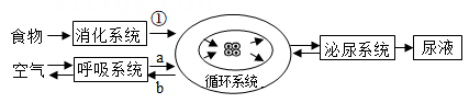 A、P是葡萄糖,Q是蛋白质 B、P 是葡萄糖.0是尿素 C、P是尿素,②是蛋白质 D、P 是尿素,Q是葡萄糖13. 下图①、③表示人体血管,②表示某器官,箭头代表血液流动的方向。下列叙述正确的是( )A、若②为皮肤,③中葡萄糖比①中多 B、若②为脑,③中含氧量比①中多 C、若②为胃,③中二氧化碳比①中多 D、若②为肾脏,③中尿素比①中多14. 某兴趣小组利用橡皮管、漏斗、水、塑料颗粒、注射器等材料制作了如图所示的肾单位模型(塑料颗粒不能透过橡皮管),模拟尿的形成过程。下列相关叙述不正确的是( )A、部位①模拟肾小球,其两端的血管都为动脉血管 B、③模拟的结构可以吸收全部的葡萄糖 C、部位③末端流出的液体是原尿 D、血液流经肾单位后,血液中的氧气会减少15. 以下为人体内物质代谢过程的知识结构及说明,其中说明有错误的是( )A、泌尿系统的重要器官是肾脏,是形成尿液的器官 B、呼吸系统的重要器官是肺,是a、b气体交换的场所 C、循环系统的重要器官是心脏,为血液流动提供动力 D、消化系统①过程表示食物的消化和吸收,主要在胃内完成16. 如下表为某人尿常规化验结果中的几项指标数据,若此人的肾脏出现病变,据此结果可推测病变的位置是( )成分