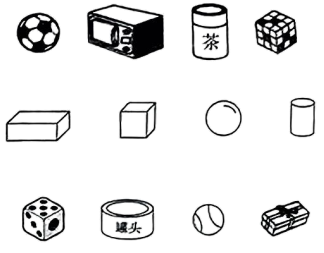 1. 下图中长方体有个,正方体有个,圆柱有个,球有个;从右边数第2个是;从左边数第2个是 , 第4个是。2. 把形状相同的物品放在一起。(填序号)3.
