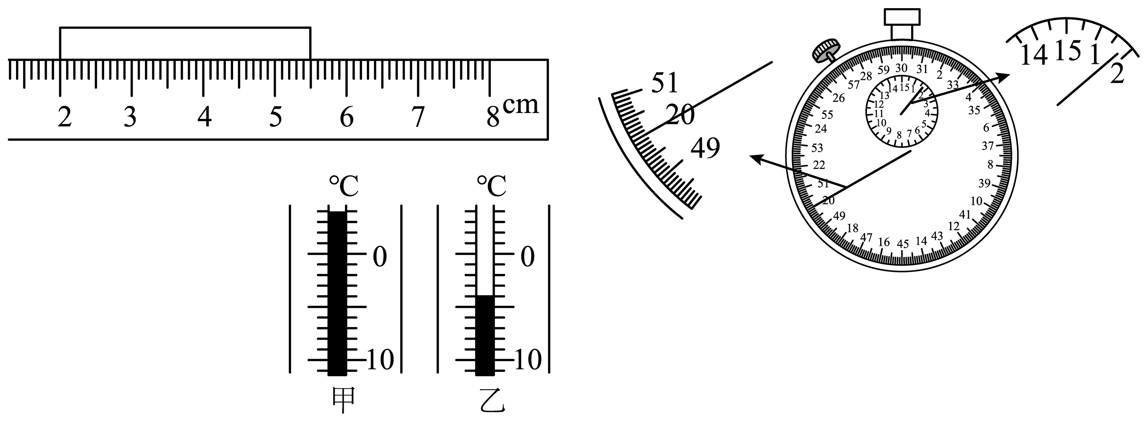 16. 如图所示,在超市里常喷一些水雾来保鲜蔬菜和水果,利用这种水雾在发生的过程中(填“吸收”或“放出”)热量,使蔬菜和水果内的分子运动速度(填“加快”或“减慢”),来达到保鲜的目的。17. 20世纪初,科学家发现原子是由原子核和电子构成的。如图是原子核式结构模型,其中,A是 , B是。通常情况下,一个原子所带的正、负电荷数是的,原子整体不显电性,物体对外也不显电性。18. (1)如图是某同学使用刻度尺测量某一物体长度的情景,则该刻度尺的分度值是mm,被测物体的长度是cm;停表的读数为s;