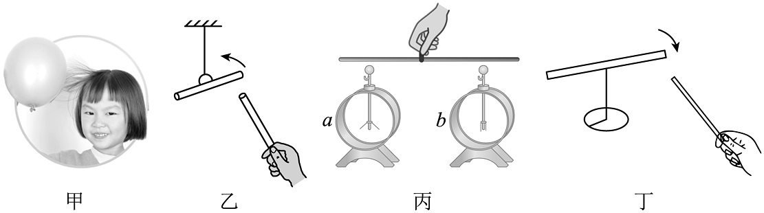 9. 如图所示是某内燃机工作时能量流向图,该内燃机的热机效率是( )A、15% B、25% C、45% D、75%10. 如图所示,在干燥环境中,取两个相同且不带电的验电器甲和乙,用毛皮摩擦过的橡胶棒接触甲的金属球,甲的金属箔片张开;再用石墨棒连接甲、乙验电器的金属球,观察到乙的金属箔片张开。下列对上述实验过程的分析错误的是( )A、毛皮摩擦过的橡胶棒带负电 B、金属箔片张开是由于同种电荷相互排斥 C、用石墨棒连接两金属球的瞬间,电流方向由乙到甲 D、若用玻璃棒连接两金属球,乙的金属箔片也会张开11. 如图是电学中的几个实验,下列说法正确的是( )A、将气球在头发上摩擦后小女孩的头发会飘起来,是因为气球带电,头发不带电 B、用毛皮摩擦的橡胶棒靠近另一根橡胶棒,它们相互排斥说明另一根橡胶棒不带电 C、a带负电,b不带电,用带绝缘柄的金属棒接触两验电器金属球时,金属棒中瞬间电流方向是从b向a移动 D、用丝绸摩擦过的玻璃棒靠近吸管一端,发现吸管向玻璃棒靠近,说明吸管一定带负电12. 随着电动汽车的发展,为电动汽车提供电能的充电桩数量需求增大。利用充电桩给汽车电池充电的过程中,汽车电池相当于电路中的( )A、电源 B、开关 C、用电器 D、导线13. 下列电路图中正确且合理的是( )A、B、