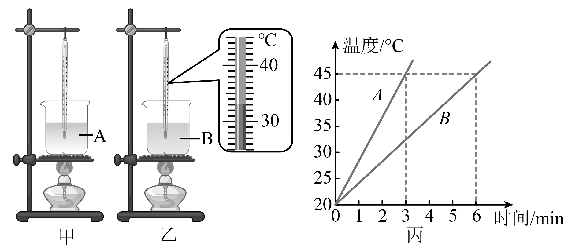 (4)、纸的着火点大约是183℃。结合以上实验可知,说明纸锅不会燃烧的原因是:纸的比水的沸点更。26. 小明为比较“不同物质吸热的情况”设计了如下的实验方案:将A、B两种液体分别装入杯中,固定在铁架台上,用两个相同的酒精灯同时加热,实验装置如图甲、乙所示,实验时每隔一段时间同时测量并记录A、B的温度。(1)、组装器材时应按照(选填“自下而上”或“自上而下”)的顺序依次安装;(2)、实验时,选取相同、初温相同的A、B两种不同液体,除了图中的器材外,该实验还需要的测量工具是天平和。(3)、此实验通过(选填“液体升高温度的多少”或“加热时间的长短”)来反映液体吸收热量的多少;(4)、根据实验数据绘制图像如图丙所示,分析可知液体(选填“A”或“B”)的吸热能力强,液体(选填“A”或“B”)更适合作为家中“暖气”中输运能量的介质。(5)、在对实验进行反思时,他们认为原方案有需要两次加热耗时长等缺点,因此改进方案并设计了如图所示的装置。与原方案相比,该方案除克服了上述缺点外还具有的优点是。(答出一个即可)27.(1)、如图所示,温度计的读数是℃,物体的长度是cm,秒表的读数是s。(2)、小华和小国两位同学利用如图甲所示装置对试管里的 20g 冰进行加热,并且每隔相同的时间记录一次温度计的示数,同时观察物质的状态。图乙和图丙是他们根据记录的实验数据分别绘制的温度-时间的关系图像,根据图像可知①若不计热量损失,则在图乙中BC阶段物体吸收的热量为J。[C冰=2.1×103J/(kg·℃)];