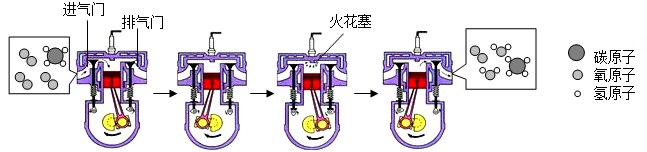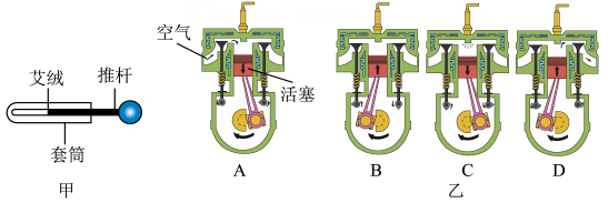 17. 如图甲是我国古代发明的一种取火器----火绒,把木制推杆快速推入牛角套筒时,杆前端的艾绒立刻燃烧起来。如图乙是小科同学建构的汽油机工作原理图。请回答:(1)、 选择艾绒作为点火材料,利用艾绒着火点低的性质,艾绒燃烧时将转化为内能。(2)、 取火时,牛角套筒内空气温度会上升,其内能改变的方式是。(3)、 取火后,推杆会自动向右回弹,此过程类似图乙中的(填字母)。18. 卡车的车厢高1.5m,师傅将一块5m长的木板搭在地面与车厢之间构成斜面(如图),在车上用400N的拉力将重为1000N的木箱匀速拉上车厢,则这个斜面的机械效率是 , 物体受到的摩擦力是N,若增大该斜面的倾角,斜面的机械效率将(选填“变大”、“变小”、“不变”)。19. 小科用图甲、乙实验装置探究“杠杆平衡条件”,每个钩码质量均相同。(1)、如图甲所示,在A点挂四个钩码,使杠杆在水平位置平衡,应在 B 点挂个相同的钩码。(2)、如图乙所示,小科制作了一个密度均匀的圆盘(相当于杠杆) ,圆盘可以绕着圆心O转动(转轴阻力忽略不计) 。为探究“力的作用点到支点的距离是否影响杠杆平衡”,他先在圆盘的 C点挂上4个钩码,又在G点挂上一定数量的钩码后,圆盘在图示位置平衡,接着他将挂在G点的钩码先后挂在 D、N两点,又进行了两次实验。若观察到现象,则说明力的作用点到支点的距离对杠杆的平衡无影响。(3)、如图丙所示,停车场入口处用横杆控制车辆进出。小科把该装置简化成如图丁所示的杠杆模型,用杠杆平衡条件分析可知,该装置属于杠杆(选填“省力”、 “费力”或“等臂”) 。20. 目前使用天然气做燃料的汽车大多数是由汽油车和柴油车改装而来的。如图所示为汽油车改装为使用天然气做燃料后,汽油机的工作原理示意图。回答问题:(1)、天然气的主要成分是甲烷,甲烷属于(选填“无机物”或“有机物”)。(2)、在做功冲程中,高温高压的燃气推动活塞向下运动,此时内能转化为。(3)、上述化学反应中,参加反应的