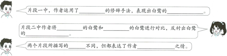 枝头闲立图白鹭生活场景图一 白鹭生活场景图而 (3)、读过片段之后同学们纷纷发表自己的看法,请你补全对话。 -