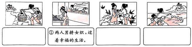 9、根据课文内容填空。(1)、这篇课文描写了和的幸福生活 ,体现了他们 , 表达了古代劳动人民。(2)、照样子,给下面的连环画排序,并配上简洁的文字。