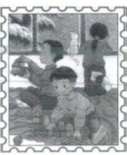(1)、童年是快乐的,邮票中的儿童在玩什么游戏?选一选,将序号填在邮票下方的括号里。①滚铁环 ②拼拼图 ③搭积木