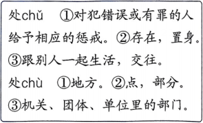 (2)、“处”在字典中的读音和解释如右图,请根据词语中“处”的意思,选择正确的读音。
