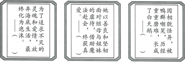 (2)、活动现场二:口才社的同学打算朗诵泰戈尔的文章。在读到“你不知道他们为什么那样急急忙忙吗?”这句话时,为了表现出花儿们此刻的心情,该用(欢快 急切 悲伤)的语气去读。(请选择合适的语气词)(3)、活动现场三:喜欢看书的小优也想组建一个社团,请为她的社团取个适合的名称:。(4)、活动现场四:书画社的成员们制作了童话故事书签,书签内容分别来自哪篇童话故事?请选择书名,将序号填写在书签内。A.《海的女儿》