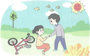 10、看图,完成练习。(1)、仔细观察上图,我们可以知道这一天的天气( )(填序号)A、晴朗 B、阴天 C、雨天(2)、图中的小女孩因为( )而摔倒了。(填序号)A、走路 B、道路不平 C、骑自行车(3)、小男孩看见小女孩摔倒了,他主动(①拉 ②推)小女孩起来。(4)、这幅图想要告诉我们的道理是( )(填序号)A、一个人骑自行车不安全。 B、当别人遇到困难时,我们要主动帮助。 C、当别人遇到困难时,如果别人求助了,我们才需要帮忙。