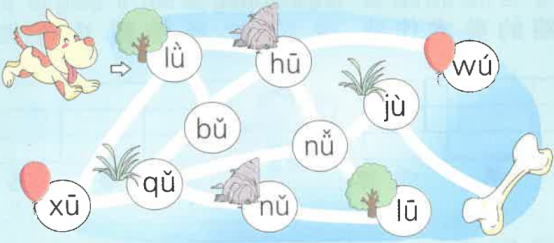 3、把韵母是ü的音节涂上红色,小狗就能吃到骨头啦!